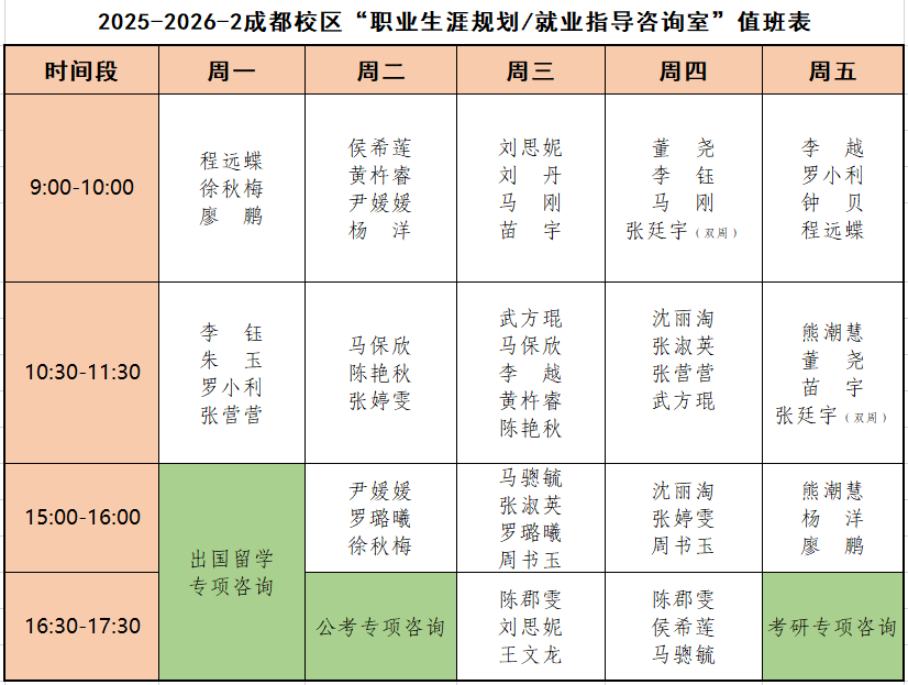 咨询学生可根据自身咨询需求和时间状况,结合咨询老师值班安排,预约相应老师或时间段进行咨询。参与咨询老师的相关简介见附件,咨询老师值班安排如下: