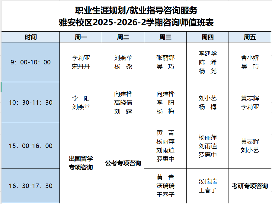 为帮助我校学生更科学地规划职业生涯,树立正确择业观,提升求职技能,雅安校区学生就业指导中心特携手各学院、第三方平台继续联合搭建职业生涯规划和就业咨询平台,现将有关事宜通知如下: