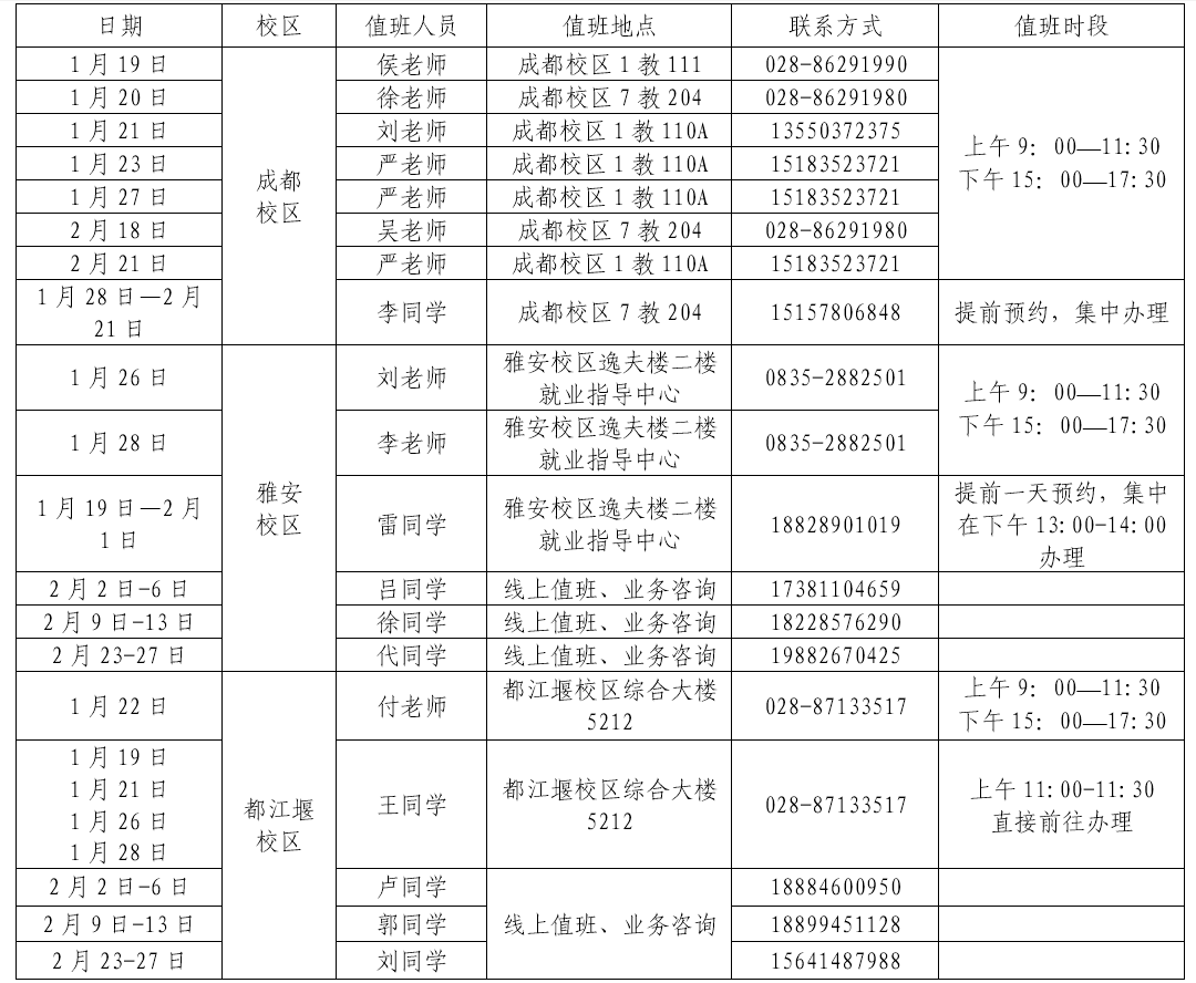 寒假即将到来,1月19日学校各部门将正式放假。2026年1月19日—2月1日工作日线下正常值班,2月2日—26日期间,原则上线下业务办理都在下学期开学后进行,如有特别紧急或特殊情况需线下办理业务,请按照下表时间、地点提前预约办理(三校区盖章业务均可跨校区办理)。